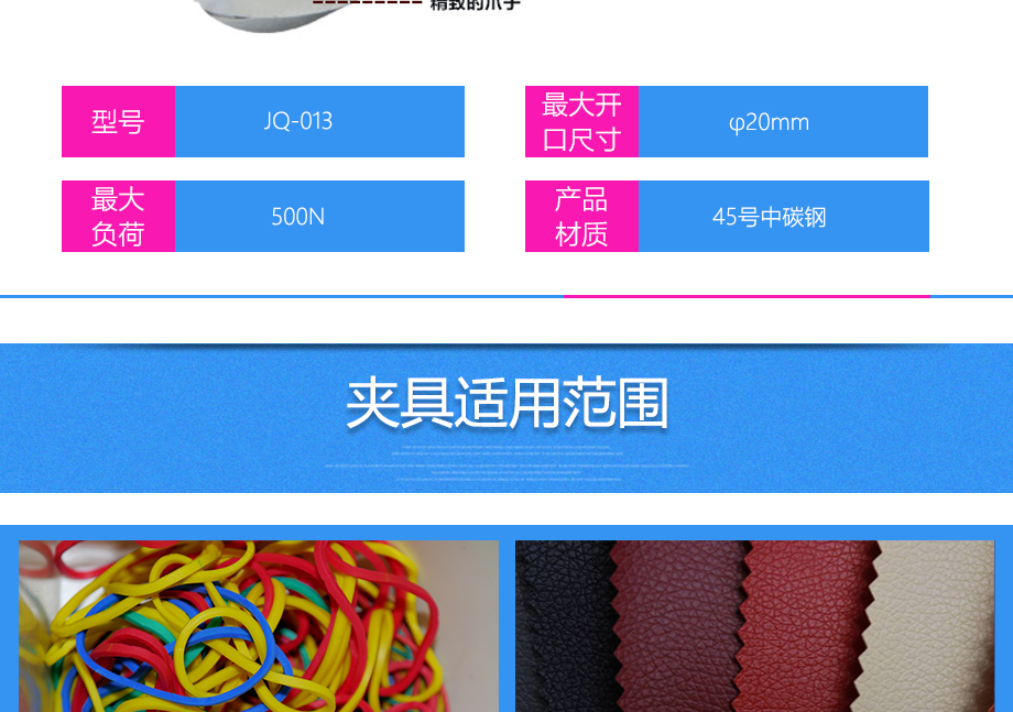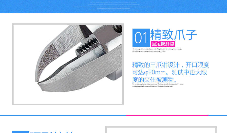 產品型號:JQ-013 品牌:劍 喬 用途:三爪鉗夾具適用范圍:橡膠、各種線纜、紙、各種電器元件、塑料薄膜等材料的拉力,破壞力測試。
