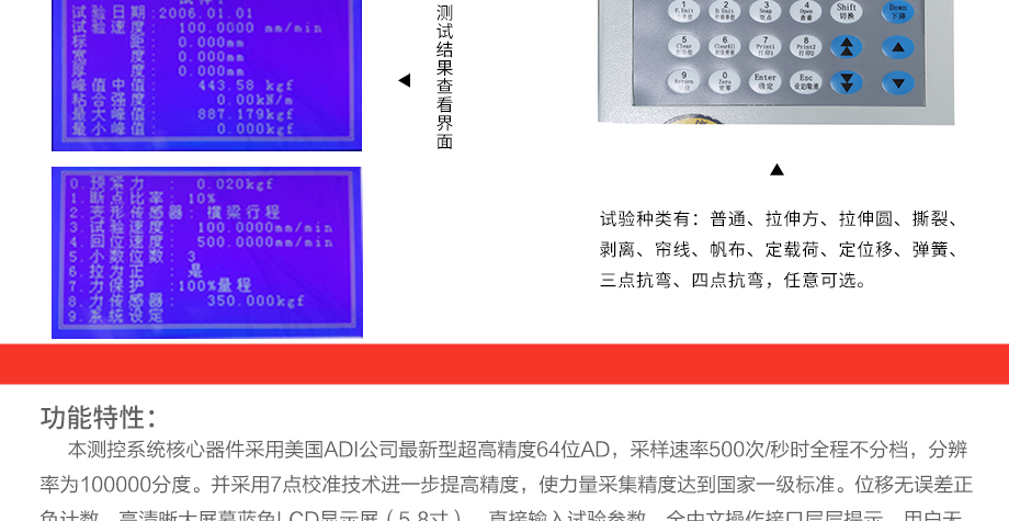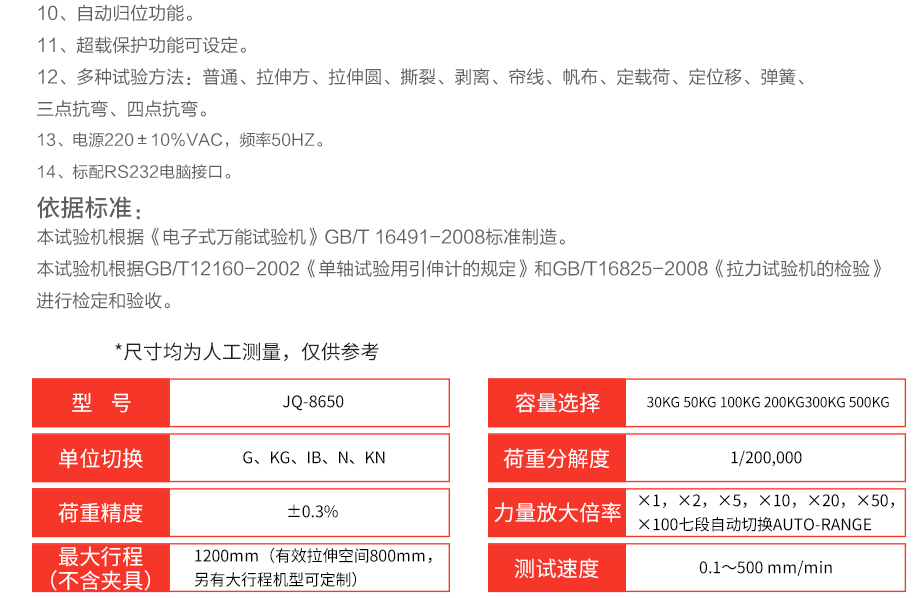 產品型號:JQ-8650 品牌:劍 喬 用途:本系列機廣泛用于各類五金、橡膠制品、鞋類、皮革、服裝、紡織、建材、絕緣體、電線、電纜、端子等各類材料。測試其拉伸、撕裂、剝離、抗壓、彎曲、抗剪切、定荷重、定位移、