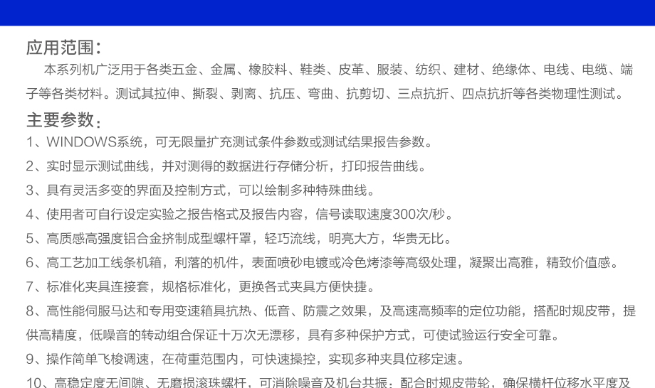 產(chǎn)品型號(hào):JQ-998(高端定制款) 品牌:劍 喬 用途:高端雙柱拉力機(jī)主要測(cè)試原物料、成品、半成品的物理特性,可做抗拉力測(cè)試、抗壓力測(cè)試、抗彎測(cè)試,取得伸長(zhǎng)量、伸長(zhǎng)率、應(yīng)力、應(yīng)變等測(cè)試結(jié)果及測(cè)試資料。