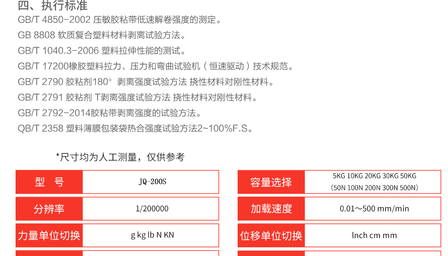 產品型號:JQ-200S 品牌:劍 喬 用途:本機是一款專業適用于膠粘劑、膠粘帶、不干膠、醫用貼劑、保護膜、離型紙、復合膜、人造革、編織袋、薄膜、紙張等相關產品的剝離、拉斷等性能測試的電子剝離試驗機,其最大試